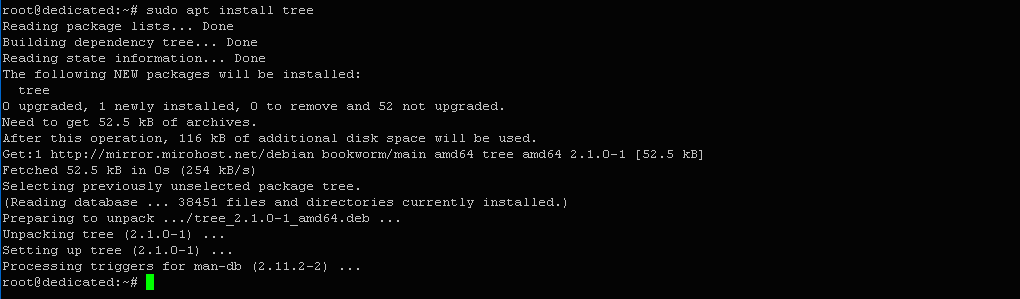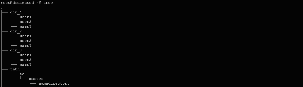 Можно убедиться, что структура была успешно создана. Но проверка заняла слишком много времени tree, выводящая на экран дерево каталогов текущей директории. Но сначала ее нужно установить из репозитория.