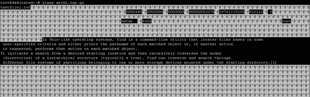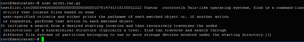 Следует отметить, что перед архивированием мы внесли в файл testfile1.txt англоязычную информацию об использовании утилиты find. Именно она сейчас отображается на экране. Это означает, что утилита z успешно работает.